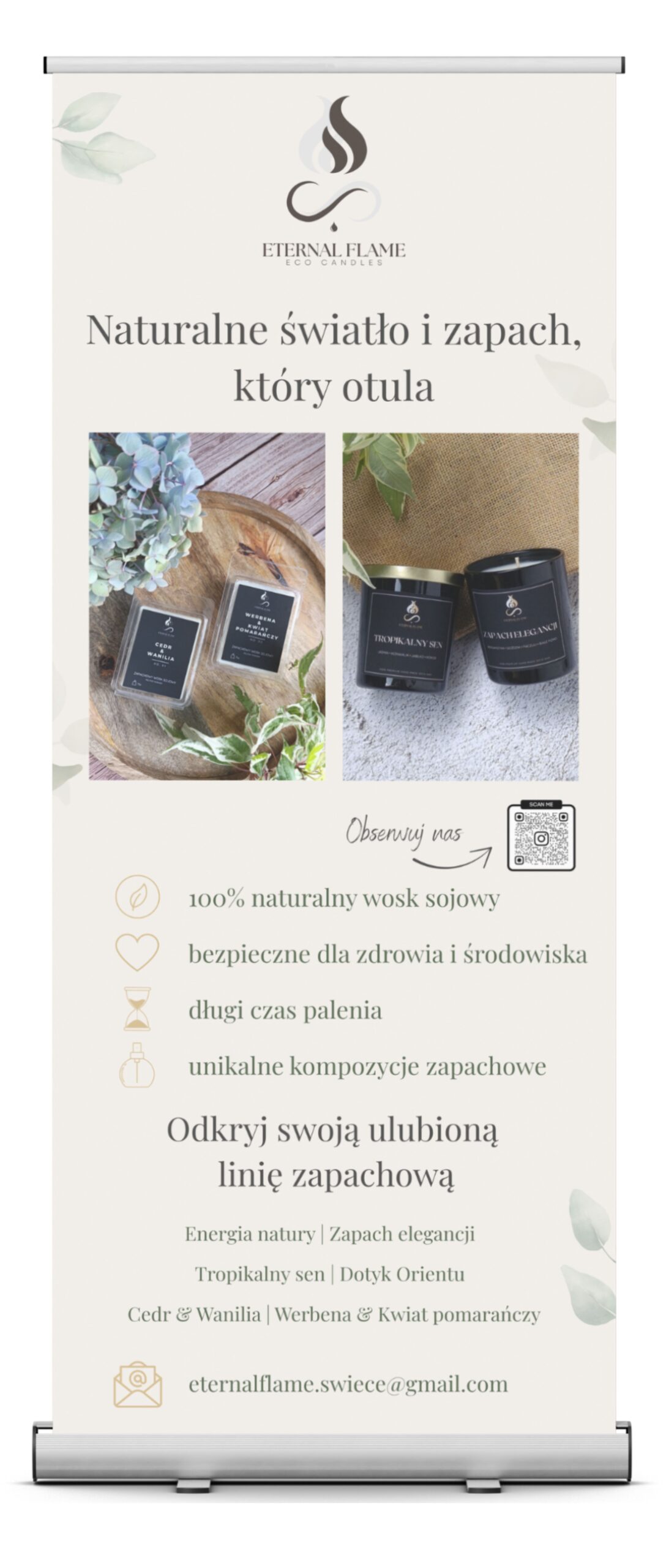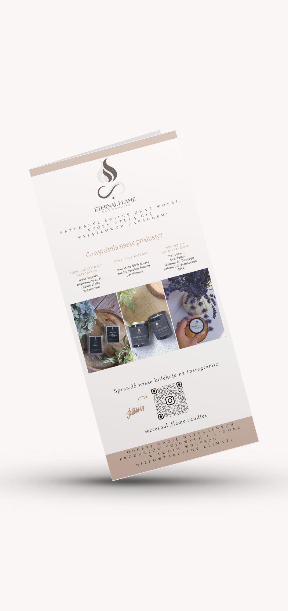 Projekt obejmował stworzenie identyfikacji wizualnej dla marki ekologicznych świec sojowych. Oprócz logo stworzone zostały projekty etykiet produktowych, ulotek, rollup’a oraz grafik na social media.